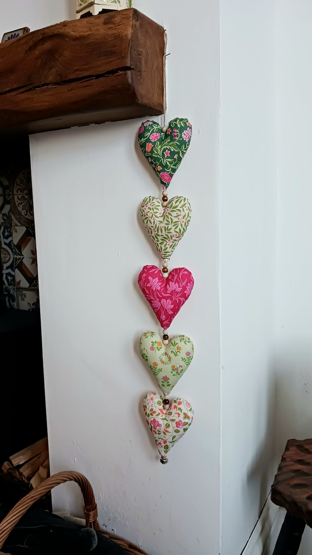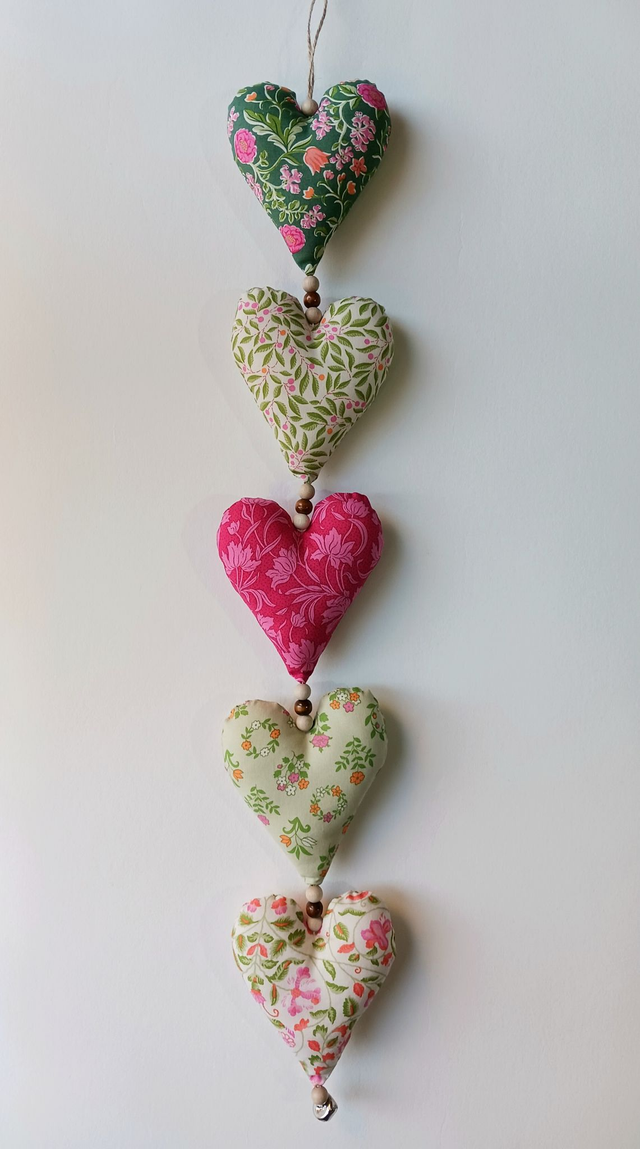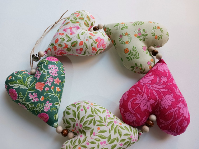 Five padded fabric hearts in five Liberty of London prints in a pink and green colour scheme.